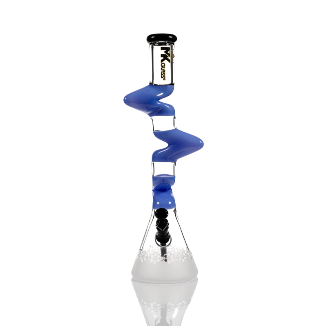 The 18" MK100 Honey Frosted Zinger is a sleek, 18-inch-tall beaker base bong with a 5mm thickness for durability. It features a 14mm joint size and comes complete with a matching 14mm Downstem and bowl. This USA made bong is available in a stylish black/blue color combination and has a frosted honey finish for added aesthetic appeal.